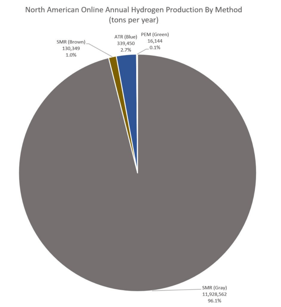 Hydrogen – from a consumption point of view – is a clean fuel because it produces zero carbon emissions when undergoing combustion or deployed in a fuel cell. However, its true carbon-neutrality depends on the method of production, which follows a colour-coded system. The most common origin of commercially produced hydrogen in the United States, by far, is steam-methane reforming (SMR). As its name suggests, the process reacts steam with methane – a common product in petroleum refineries – to produce hydrogen and carbon dioxide. This avenue of production is termed “grey” hydrogen and does not fall under the umbrella of “clean” hydrogen because of its carbon dioxide byproduct. Discussions of clean hydrogen usually refer to the “blue” and “green” variants. The former is produced via SMR just like its grey sibling, except the carbon dioxide byproduct is captured and sequestered in the process. The latter uses an entirely different mechanism called electrolysis in which water is split into its two constituent elements: oxygen and hydrogen. To conduct electrolysis, electricity must be supplied as an energy input, effectively generalizing green hydrogen production as a power-to-gas process using renewables such as solar and wind. Of the total North American hydrogen capacity online today, 96.1% is the grey type, while blue and green makes up 2.7% and 0.1% respectively.